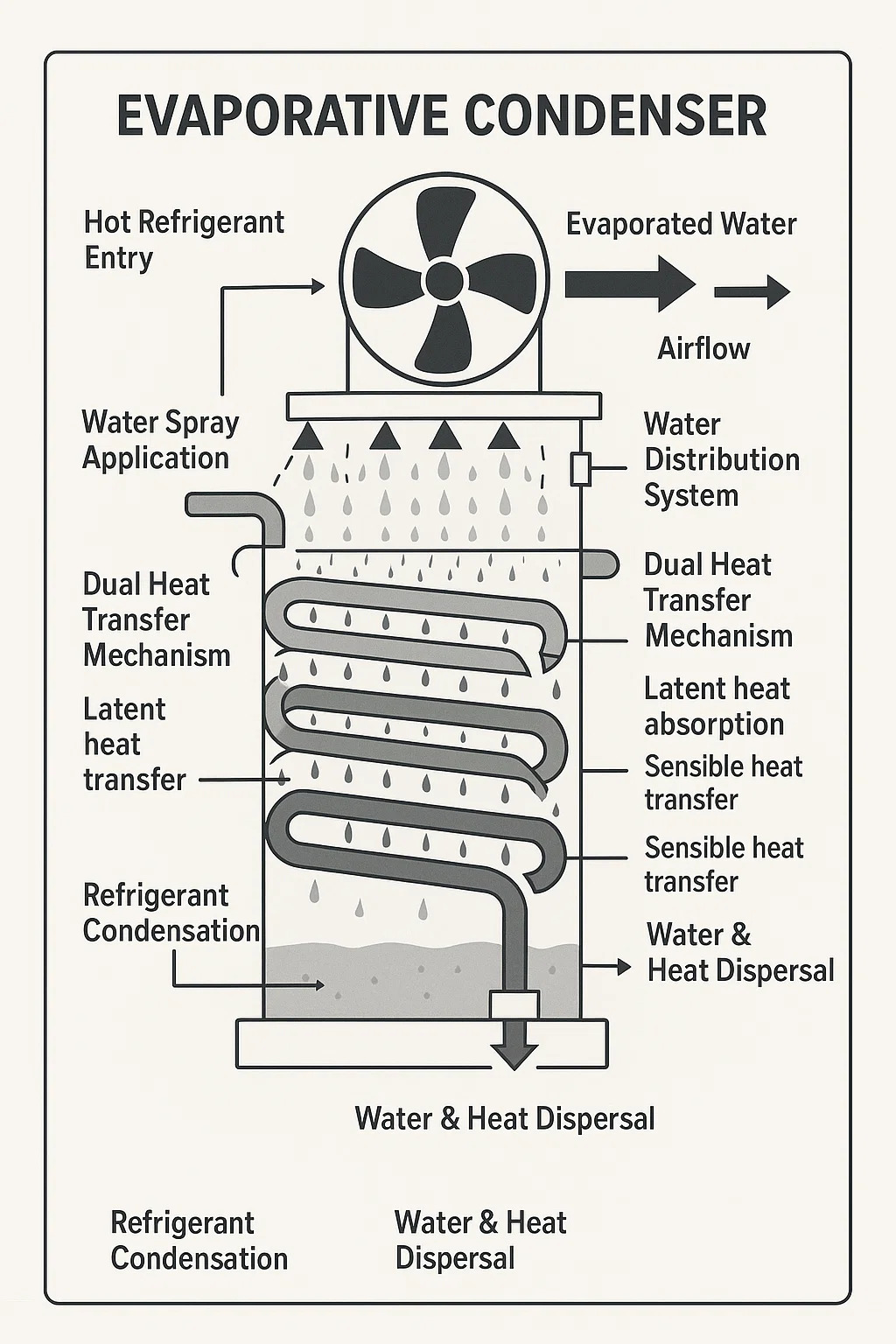 Fordampningskondensatorer afviser varme ved at kombinere luftkøling med vandfordampning. I modsætning til standardkondensatorer, der udelukkende er afhængige af fornuftig varmeoverførsel, udnytter de latent varmeabsorption under vandfordampning.