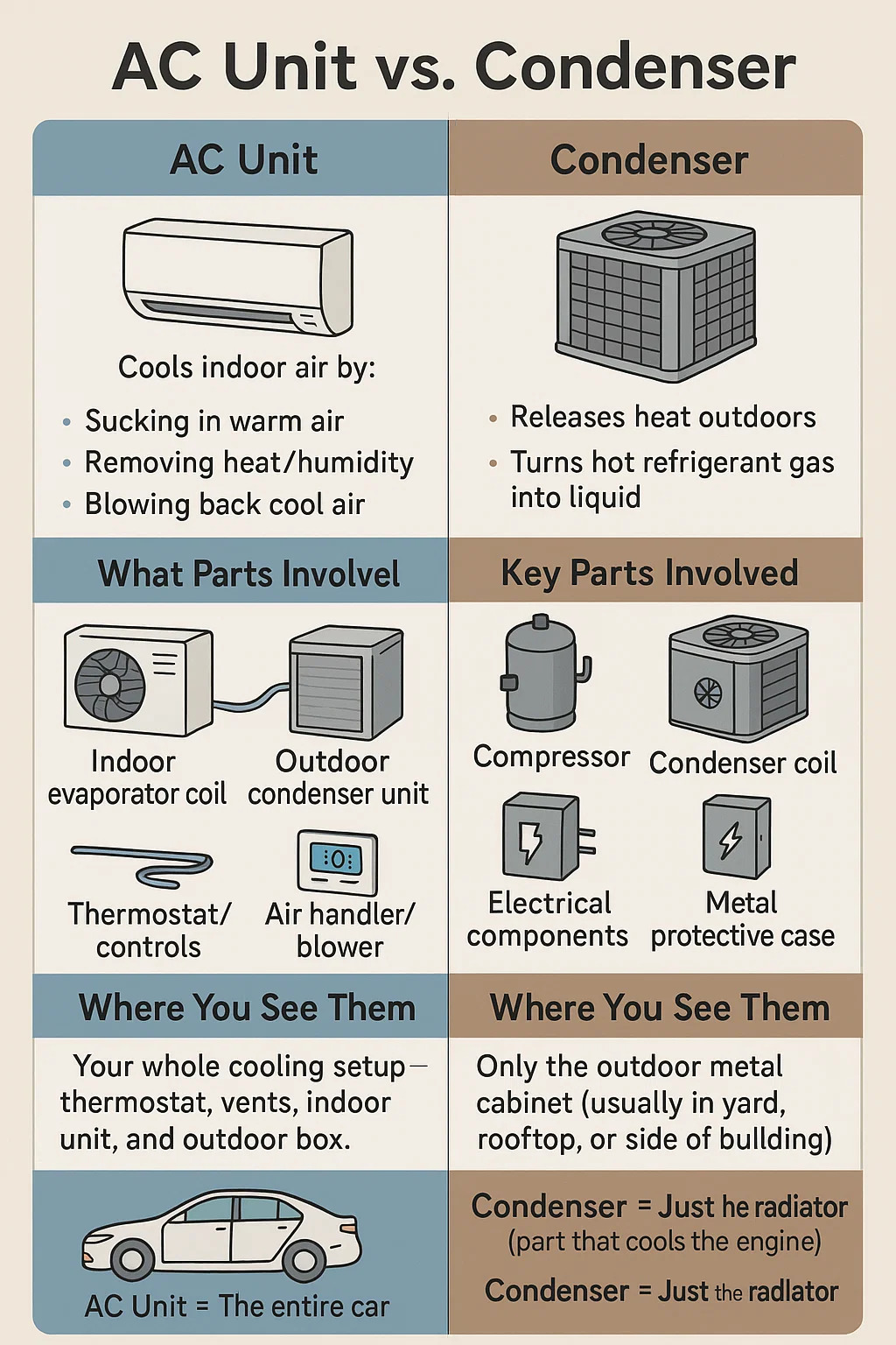Her er den klare forskel mellem et klimaanlæg (AC-enhed) og en kondensator :